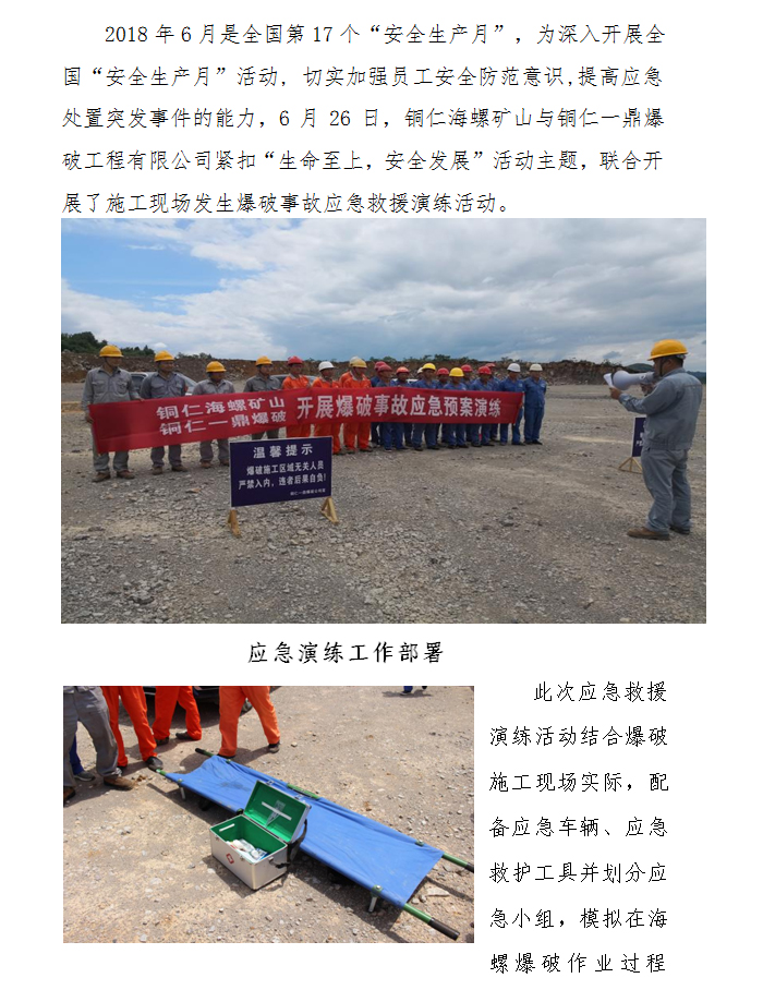 > 銅仁海螺礦山與銅仁一鼎爆破聯(lián)合開展“安全生產(chǎn)月”爆破事故 應(yīng)急救援演練活動(dòng)