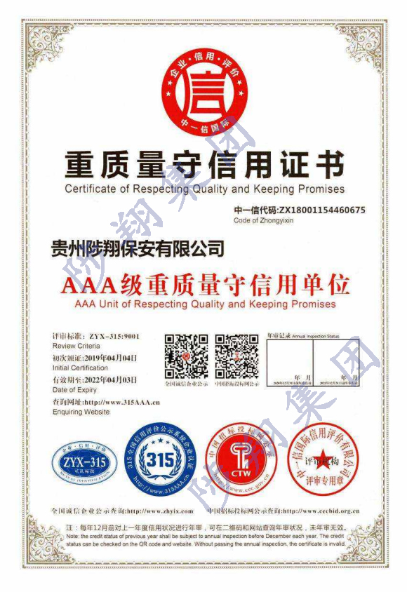 重質(zhì)量守信用證書